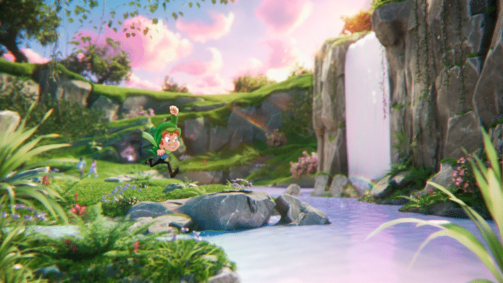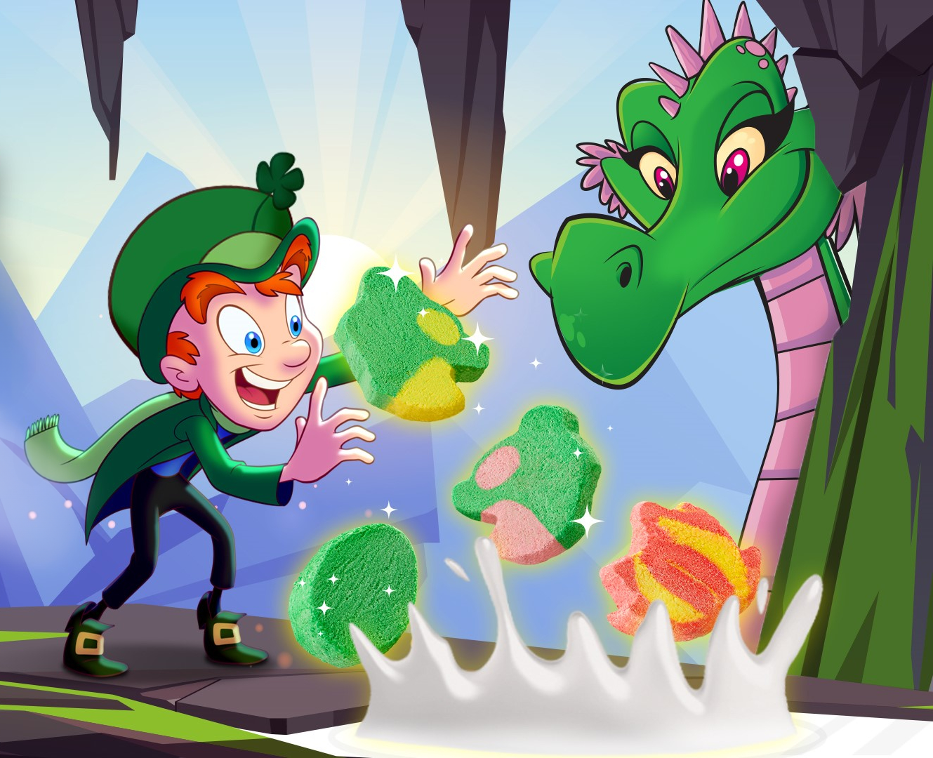 8 floating doors to multiple charm worlds, 4 milk-tech revealing marshmallows, 1 portal to an infinite milky tunnel, and a charming dragon with impeccable winged liner later, catch Lucky on his newest adventures against hungry kids after his magically delicious cereal.